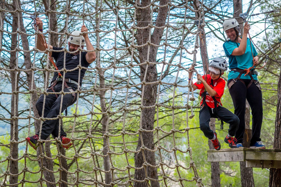 Puentes tibetanos, tirolinas de 100 metros, lianas… entre pinos. Con circuitos aptos a partir de los 6 años. Diversión en Saltapins para niños y adultos